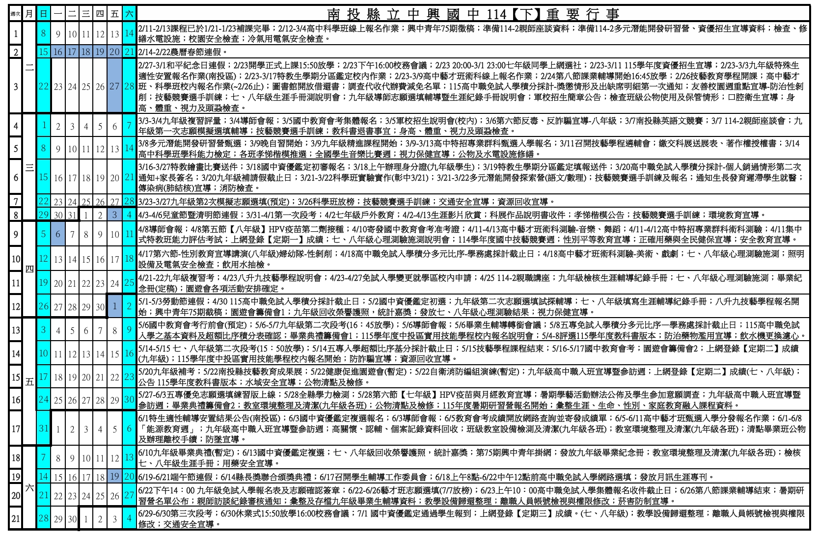 ■「TPASS 2.0+ 常客優惠,自114年12月1日開始累計回饋」■(一)小心觸法!現已全面禁止電子煙,連使用也違法! (二)依《菸害防制法》新修訂規定,提醒您現已全面禁止電子煙! (三)無菸才能大口呼吸,提醒您紙菸、電子煙、加熱菸都有二手菸危害! (四)追求青春無菸害,提醒您合法吸菸年齡已提高至二十歲! (五)邀您實踐無菸環境,大專院校、幼兒園、托嬰中心等場所全面禁菸。 ■南投縣衛生局製作「不明野菇、不採不食」宣導!請點選此連結!■本校勇奪「2025中部三級學生棒球聯賽冠軍」!■南投縣政府消防局教育宣導■您有親子、婚姻、人際及情緒困擾嗎?請撥打家庭教育諮詢專線412-8185(手機請加02),南投縣家庭教育中心關心您! ■電子菸使用規範:一、小心觸法!現已全面禁止電子煙,連使用也違法! 二、依《菸害防制法》新修訂規定,提醒您現已全面禁止電子煙! 三、無菸才能大口呼吸,提醒您紙菸、電子煙、加熱菸都有二手菸危害! 四、追求青春無菸害,提醒您合法吸菸年齡已提高至二十歲! 五、邀您實踐無菸環境,大專院校、幼兒園、托嬰中心等場所全面禁菸。 ■「公共工程要更好,全民督工不可少,全民督工通報專線0800-009-609」 ■內政部消防署消防防災館網頁「https://www.tfdp.com.tw」,供學校師生透過網路學習正確消防知識。■行政院資通安全處資安宣導「密碼換新、程式更新、下載要當心」。